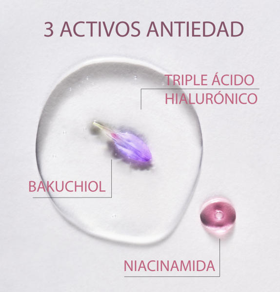 Entre sus activos principales se encuentra el ácido hialurónico en tres diferentes pesos moleculares. El ácido hialurónico de alto peso molecular, que consigue hidratar y reparar la piel dejándola suave y tersa, el ácido hialurónico de medio peso molecular que ayuda a mantener la piel hidratada desde dentro y el ácido hialurónico de bajo peso molecular que consigue penetrar en mayor profundidad, hidratando y ofreciendo un efecto rellenador de arrugas. Otro ingrediente es el Bakuchiol, que reduce líneas de expresión y arrugas gracias a su poder antioxidante y propiedades de renovación celular. Por último, la Niacinamida permite atenuar las manchas y aportar luminosidad, unificando el tono de la piel.