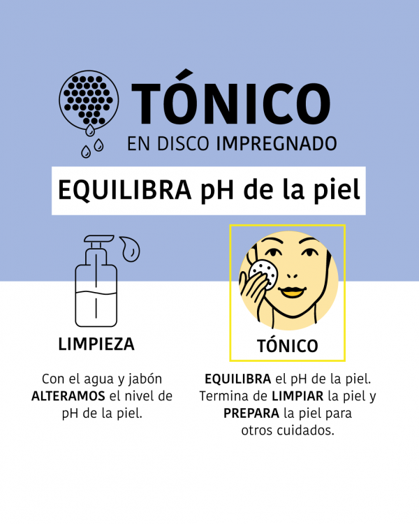 Los Discos Tónico hidratante y calmante tonifican, hidratan y calma la piel, reequilibrando el pH para mejorar la absorción de activos, disminuyendo las rojeces, favoreciendo los procesos de cicatrización, hidratando en profundidad y aportando frescura, elasticidad y suavidad a la piel.