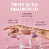 Entre sus activos principales se encuentra el Ácido Hialurónico en tres diferentes pesos moleculares. El ácido hialurónico de alto peso molecular consigue hidratar y reparar la piel dejándola suave y tersa. El ácido hialurónico de medio peso molecular ayuda a mantener la piel hidratada desde dentro. El ácido hialurónico de bajo peso molecular consigue penetrar en mayor profundidad  hidratando y ofreciendo un efecto rellenador de arrugas, dejando la piel más firme y elástica.