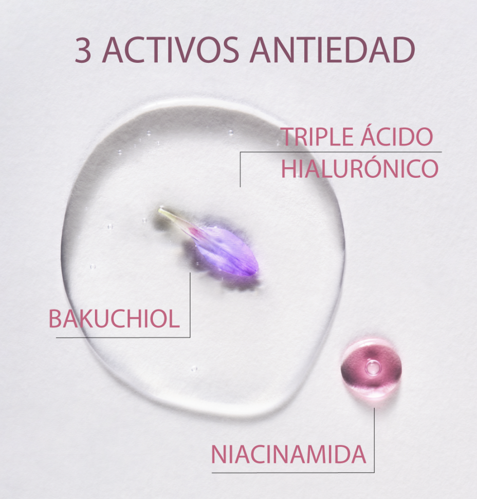 Entre sus activos principales se encuentra el Ácido Hialurónico en tres diferentes pesos moleculares. El ácido hialurónico de alto peso molecular consigue hidratar y reparar la piel dejándola suave y tersa. El ácido hialurónico de medio peso molecular ayuda a mantener la piel hidratada desde dentro. El ácido hialurónico de bajo peso molecular consigue penetrar en mayor profundidad  hidratando y ofreciendo un efecto rellenador de arrugas, dejando la piel más firme y elástica.